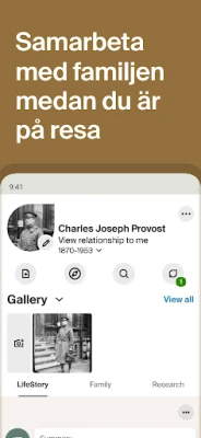 Att bevara din släkthistoria har aldrig varit enklare. Skapa ett personligt anpassat släktträd, ladda upp gamla familjefoton och dokumentera anekdoter som levandegör varje persons berättelse. Samarbeta smidigt med familj och vänner, och låt allas bidrag berika det gemensamma arvet. Ancestry® erbjuder även kostnadsfritt att skapa ditt släktträd och söka bland över en miljard folkräkningstexter, samt att ta del av personliga tips som hjälper dig framåt i din forskning. Upplev en modern och användarvänlig design som gör varje steg i din upptäcktsresa både enkel och inspirerande, oavsett om du använder telefon eller surfplatta.