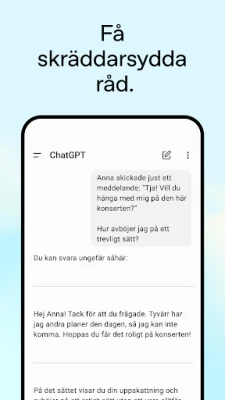 Oavsett om du söker inspiration, behöver skräddarsydda råd eller vill fördjupa dina kunskaper, är ChatGPT ditt verktyg. Generera unika presentidéer eller skapa personliga gratulationskort med lätthet. Få hjälp med att formulera ett svar i en knepig situation eller upptäck nya perspektiv på komplexa problem. För lärande kan den anpassa förklaringar – som att pedagogiskt beskriva elektricitet för ett dinosaurieälskande barn – eller fräscha upp dina insikter om historiska händelser. Även i professionella sammanhang kan du brainstorma fram slagkraftiga marknadsföringstexter eller utveckla detaljerade affärsplaner.